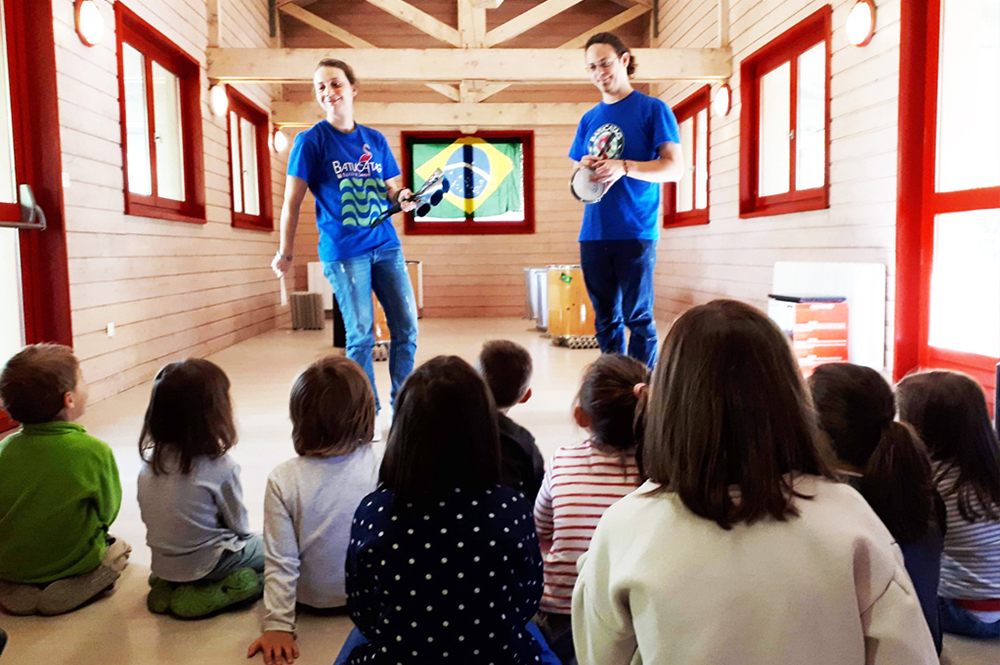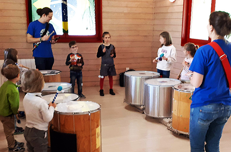 Pour les plus petits, à partir de la maternelle, nous abordons le samba sous forme d’éveil musicale, avec des comptines brésiliennes, de la danse et des percussions corporelles, également avec la découverte de petits instruments adapté aux plus petits.